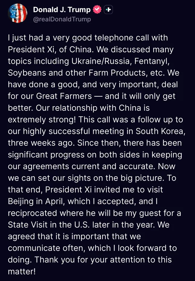 如图,昨晚特朗普在社交媒体上发布的一则短文简报,其实跟他这几年发过很多小作文都类似,内容本身并没有啥值得好说,即使这段话让昨晚的美股涨了不少。