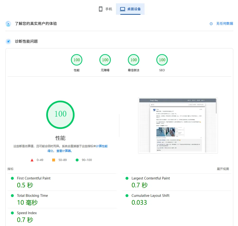 LightHouse桌面设备评分4个100,但也一时看着实在有点难以入眼,还得再习惯习惯,包括手机访问体验等得空再继续打理。旧版截图存档,做个纪念。