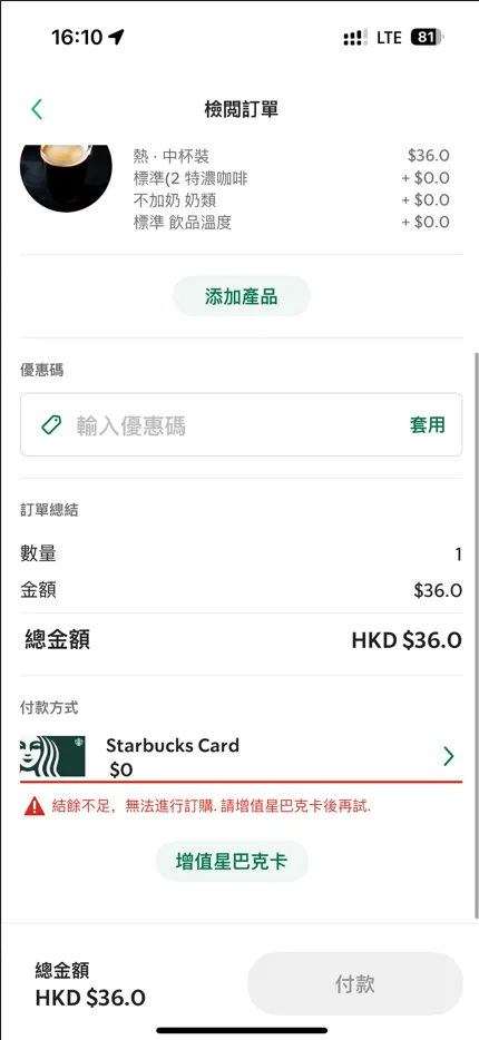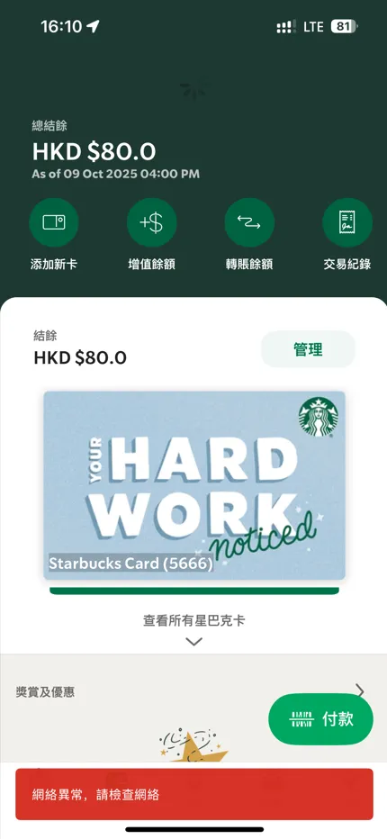 香港不愧称为IT荒漠,就Starbucks这种级别的企业了,官方App出这么大问题,这半年内都遇到2次了,上次是APP无法充值(持续了至少6天),这次是用户profile api挂了(从7号周2发现,一直到昨天9号也没好),无法拉取账户余额,进而无法App下单扣费。